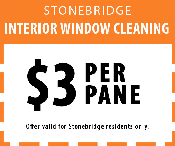 As a benefit of our partnership with StoneBridge, we are extending a promotional offer to all of their residents. Until June 22, 2019, we are offering $3 per pane for interior window cleaning.